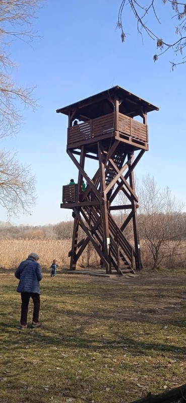 Itt viszont nagyon kellemes pihenőhelyre érkeztünk. Letelepedtünk az asztalokhoz, és a fiúk rögtön csokival köszöntöttek minket Nőnap alkalmából. (Feri stílusosan apró mackó csokikkal – majdnem pontosan 7 évvel ezelőtt hozta először a kabalánkat, a mackóját). Előkerült a csúcsital is, pedig ezen a sík terepen csúcsra csak az mehetett, aki felmászott a kilátóba. Elfogyasztottuk az otthonról hozott elemózsiát, pihentünk egy kicsit, majd folytattuk utunkat a Béka tanösvényen, megkerülve a mocsarat. Még néhány km-t gyalogoltunk szántóföldek mellett, és mire becammogtunk a rákoskerti állomásra, már a vonatunk is megérkezett. A melegtől elcsigázottan, de vidáman szálltunk fel a vonatunkra, ami hazafele vette az irányt velünk.